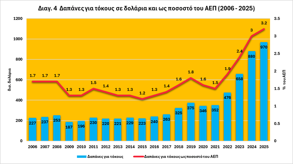 Από το 2022 και μετά, η άνοδος του μέσου επιτοκίου για το σύνολο των τίτλων είναι η ταχύτερη της εικοσαετίας. Το διάγραμμα των τόκων αποτυπώνει αυτή τη μεταβολή με δραματικό τρόπο: οι τόκοι εκτοξεύονται από 476 δισ. δολάρια το 2022 σε 970 δισ. δολάρια το 2025, το μεγαλύτερο ποσό που έχει δαπανηθεί ποτέ για τόκους στον ομοσπονδιακό προϋπολογισμό19, ενώ ως ποσοστό του ΑΕΠ αυξάνονται από 1,6% σε 3,195%, πολύ κοντά στο ιστορικό υψηλό 3,2% του 1991 (βλ. διαγ. 4).