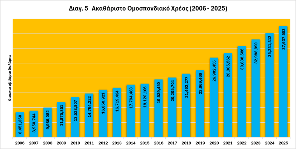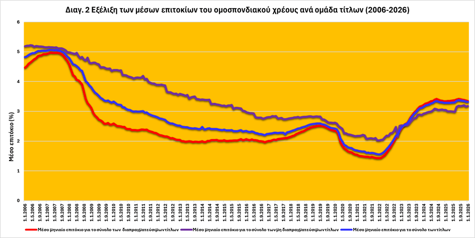 Το διάγραμμα 2 απεικονίζει τη διαχρονική εξέλιξη των μέσων μηνιαίων επιτοκίων των διαπραγματεύσιμων και μη διαπραγματεύσιμων τίτλων, αλλά και του μέσο μηνιαίου για το σύνολο των τίτλων του αμερικανικού Δημοσίου κατά την περίοδο Ιανουάριος 2006 – Ιανουάριος 2026.