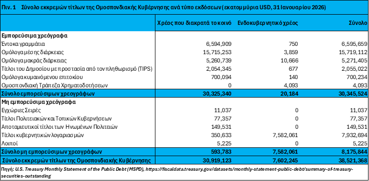 Η σύνθεση των εκκρεμών τίτλων της Ομοσπονδιακής Κυβέρνησης (Total Public Debt Outstanding), ανά τύπο χρεογράφων φαίνεται στον πίνακα 1. Η ταξινόμηση είναι η επίσημη λογιστική δομή που χρησιμοποιεί το υπουργείο Οικονομικών των ΗΠΑ στη «Μηνιαία Κατάσταση του Δημόσιου (Ομοσπονδιακού) Χρέους» (Monthly Statement of the Public Debt – MSPD). Το χρέος κατηγοριοποιείται ανάλογα με το αν είναι εμπορεύσιμο ή μη εμπορεύσιμο και αν πρόκειται για χρέος που διακρατά το κοινό ή ενδοκυβερνητικό χρέος1.