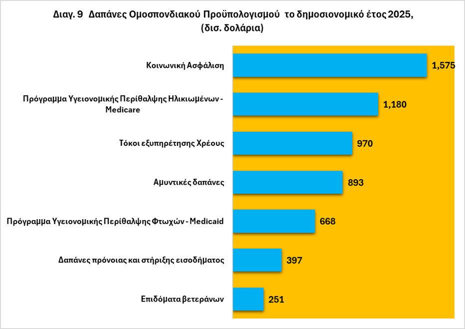 Το 2025 οι καθαρές πληρωμές τόκων για την εξυπηρέτηση του υπάρχοντος χρέους, ξεπέρασαν για πρώτη φορά στη σύγχρονη ιστορία τις δαπάνες εθνικής άμυνας, αντιπροσωπεύοντας το τρίτο μεγαλύτερο κονδύλι στον ομοσπονδιακό προϋπολογισμό μετά την Κοινωνική Ασφάλιση και το Medicare (βλ. πιν. 9).