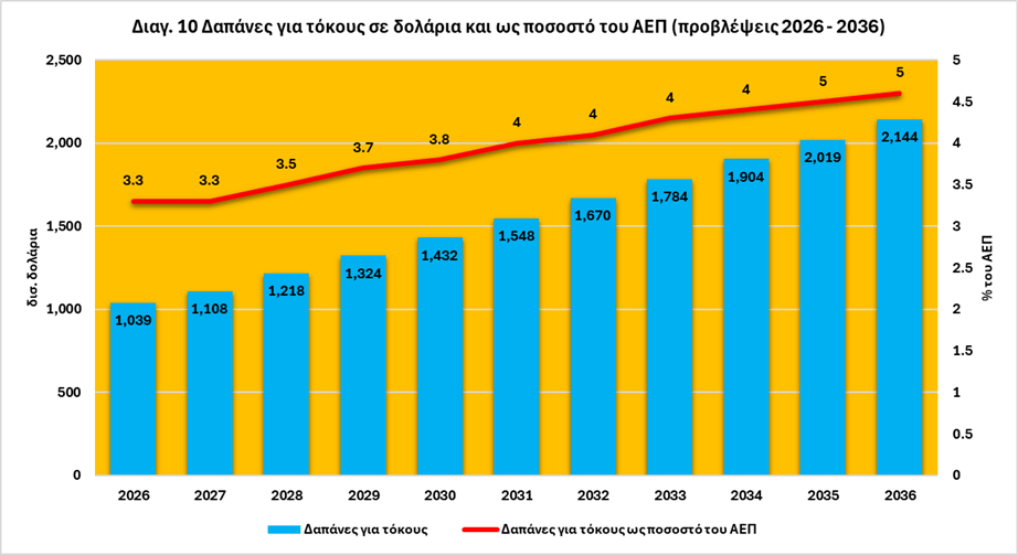 Τα υψηλότερα βραχυπρόθεσμα και μακροπρόθεσμα επιτόκια τα τελευταία χρόνια για την αντιμετώπιση του πληθωρισμού αύξησαν σημαντικά το κόστος τόκων του εθνικού χρέους. Το CBO προβλέπει ότι το κόστος τόκων το 2026 θα κατακτήσει και νέα κορυφή και θα ανέλθει στα 1.039 δισεκατομμύρια δολάρια φέτος και στη συνέχεια θα διπλασιαστεί για να φτάσει τα 2,1 τρισεκατομμύρια δολάρια έως το 2036. Κατά την επόμενη δεκαετία, οι πληρωμές τόκων της κυβέρνησης των ΗΠΑ για το εθνικό χρέος προβλέπεται να ανέλθουν σε 16,2 τρισεκατομμύρια δολάρια – το υψηλότερο ποσό σε δολάρια για τόκους σε οποιαδήποτε ιστορική δεκαετή περίοδο και σχεδόν διπλάσιο από το σύνολο που δαπανήθηκε τις τελευταίες δύο δεκαετίες μετά την προσαρμογή για τον πληθωρισμό. Όπως φαίνεται στο διάγραμμα 10, σε σχέση με το μέγεθος της οικονομίας, το κόστος των τόκων θα φτάσει το 3,3% του ΑΕΠ το 2026 – ξεπερνώντας το προηγούμενο υψηλό που είχε σημειωθεί το 1991 και θα ανέλθει στο 4,6% του ΑΕΠ έως το 203622.