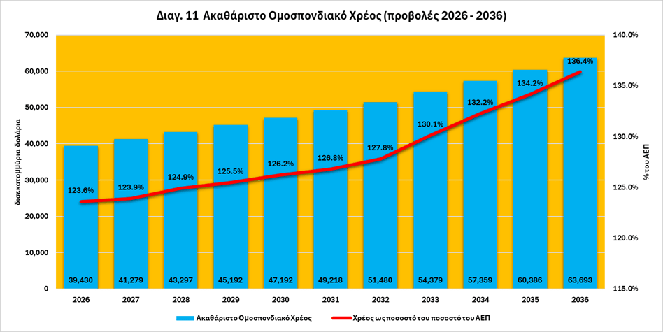 Στις βασικές προβολές του CBO, το ομοσπονδιακό χρέος που διακρατά το κοινό αυξάνεται από 32.095 δισεκατομμύρια δολάρια ή 100,6% του ΑΕΠ το 2026, σε 56.152 δισεκατομμύρια δολάρια ή 120,2% το 2036, ξεπερνώντας το προηγούμενο υψηλό του 106% του ΑΕΠ το 1946. Ενώ το δημόσιο χρέος αυξάνεται κατά 24 τρισεκατομμύρια δολάρια την περίοδο 2026 – 2036, το ενδοκυβερνητικό χρέος παραμένει σχετικά σταθερό, φτάνοντας κατά μέσο όρο ετησίως τα 7 τρισεκατομμύρια δολάρια την επόμενη δεκαετία. Ως αποτέλεσμα, το ακαθάριστο ομοσπονδιακό χρέος προβλέπεται επίσης να αυξηθεί κατά 24 τρισεκατομμύρια δολάρια κατά την ίδια περίοδο, φτάνοντας τα 63,7 τρισεκατομμύρια δολάρια στο τέλος του 2036 ή 136, 4% του ΑΕΠ23.