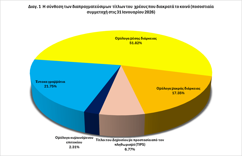 Οι τόκοι υπόκεινται σε ομοσπονδιακό φόρο εισοδήματος, αλλά απαλλάσσονται από πολιτειακούς και τοπικούς φόρους στις ΗΠΑ. Τον Ιανουάριο του 2026, η μέση ετήσια απόδοση επί του υφιστάμενου αποθέματος των T-Bills ήταν 3,760%4. Τα έντοκα γραμμάτια αποτελούν το 21,75% του συνόλου των διαπραγματεύσιμων τίτλων που διακρατά το κοινό στις 30 Ιανουαρίου 2026 (βλ. διαγ. 1).